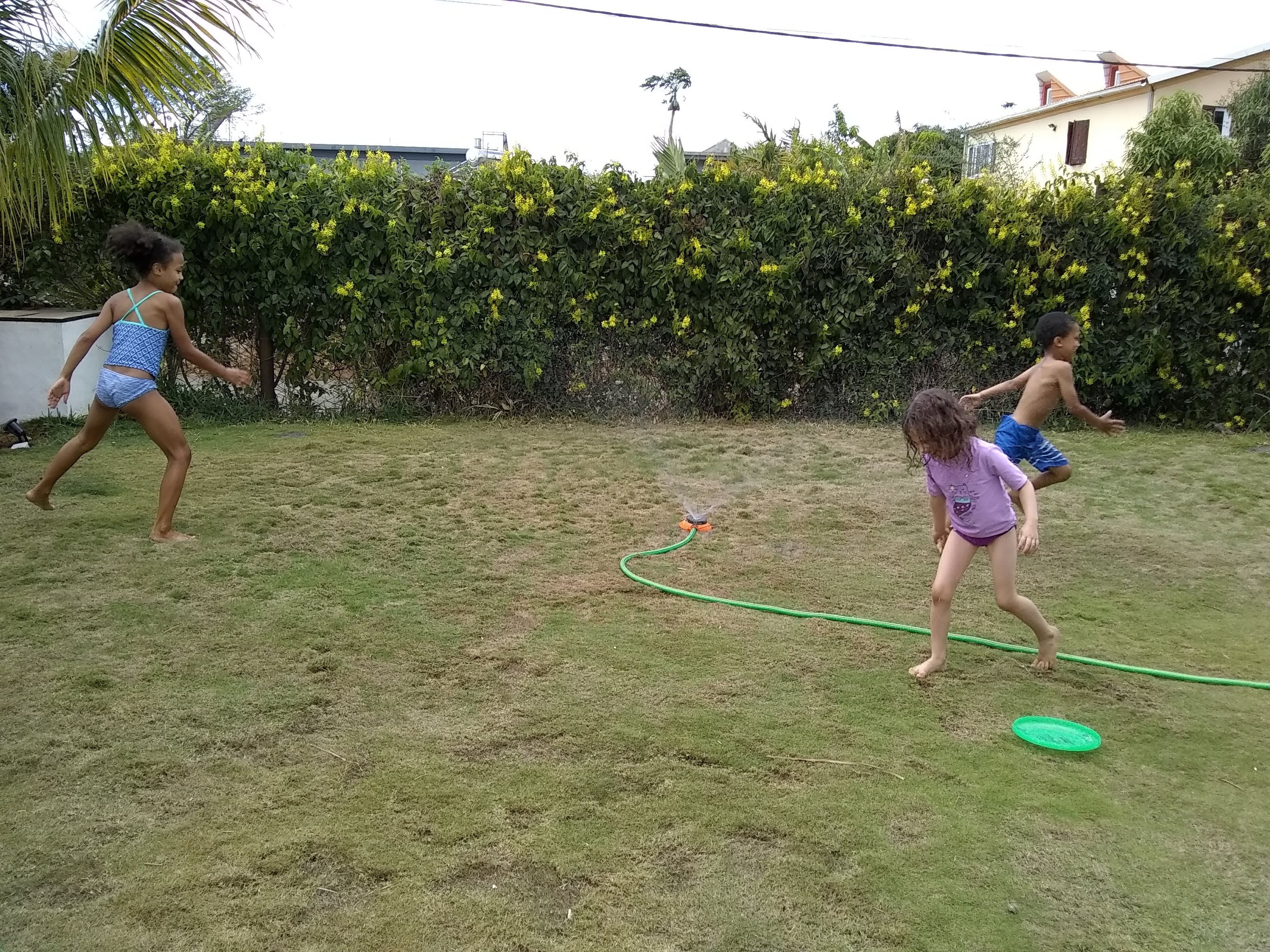 I spent the rest of the afternoon continuing to clean, unpack, and organize things in our new home while intermittently managing disputes between the children. Having noticed that there was a lawn sprinkler in the yard, I decided to let the kids have some fun by playing in the sprinkler. I found the outdoor hose and dragged it over to the sprinkler, but there was no nozzle on the hose to attach to the sprinkler. The hose looked like it had been cut off on the end. Trying to make it work, I shoved the cut hose end onto the sprinkler. The kids were excited and put on their swimsuits. They ran to the sprinkler and waited for me to turn on the water. I turned it on. The sprinkler sprayed only for a moment before the hose popped off. I turned the water off, reattached the hose, and tried again. The hose popped off again. Not wanting to ruin the children’s excitement, I went inside and found one of the zip ties we had used to secure our packing crates during our flights. I attached the hose and this time secured it with a zip tie. I turned the water on, and it worked! The kids ran circles around the sprinkler until two minutes later the hose popped off again. That was it; the sprinkler was done. Taking it in stride, the kids pulled off their swimsuits and put on their dry clothes again. So much for trying to entertain them. (Side Note: We also don’t have a TV yet, so they are doing remarkably well considering they are left strictly to their imaginations and the few toys and books we brought with us.)