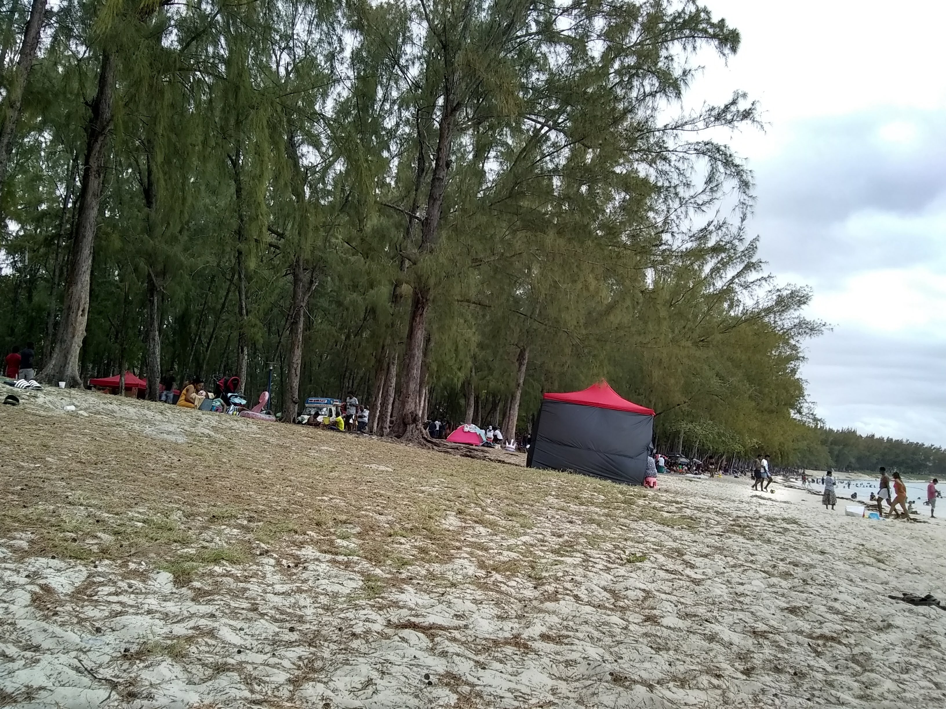 Saturday (November 14th) was also Diwali, one of the most important Hindu festivals, also called the Festival of Lights. The festival revolves around the triumph good over evil, purity over impurity, and light over darkness. We weren’t quite sure what to expect since at least half of the population in Mauritius is Hindu. We had been told that people put strings of lights on their houses to celebrate (like Christmas lights). They also make sweet treats to share with friends and family. So, we were pleasantly delighted as we drove home from Mrs. Akehurst’s house Saturday night to see lots of brilliant light displays. What we weren’t expecting were the fireworks! It was actually a bit scary to be driving through these small towns at night because on either side of the narrow two-lane roads, people were setting off firecrackers and fireworks of various sizes. More than once I thought for sure something was going to hit our car, but we made it home safely. The fireworks continued well into the night, cracking and banging all around our house. The following afternoon (Sunday), we decided to go to the beach so that we could finally stick our toes in the Indian Ocean. We went to the popular Mont Choisy Beach. We had been warned that it might be crowded because of people celebrating Diwali, and it was. There were tents all along the beach, and families were gathered barbecuing and playing music and swimming. It was like everyone was having their family reunion at the beach!