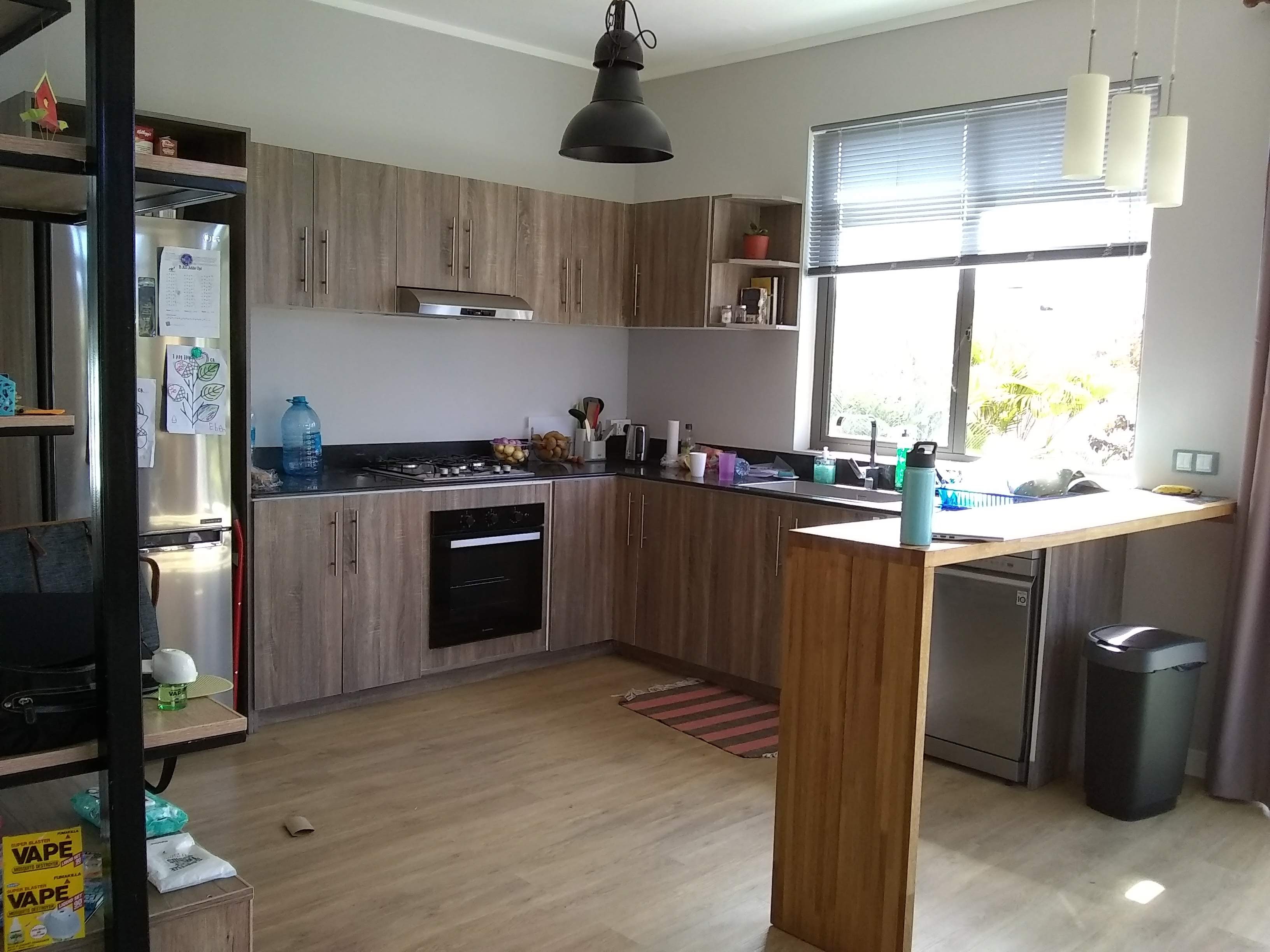 The house has an open living, dining, and kitchen area on the lower level, along with a guest bedroom and a bathroom/laundry. The upper level has three additional bedrooms and three small bathrooms. There are large patio doors and windows throughout the house that we generally leave wide open during the day to catch the breeze since there is no air conditioning except for small wall units in two bedrooms. Our house, like most houses here, is surrounded by a tall fence/wall enclosure. We have been told many times that Mauritius is a very safe place, so it seems the wall is really more about privacy than security. Regardless, we have a large gate that we tend to keep locked unless we are going in and out.